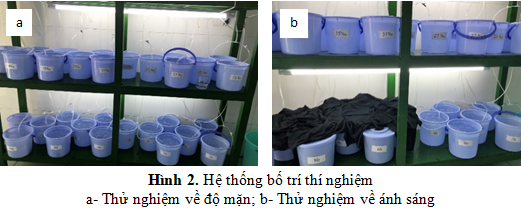 Thí nghiệm được bố trí ở các mức độ mặn khác nhau: (i) 23‰; (ii) 28‰; (iii) 31‰; (iv) 35‰; (v) 37‰, mỗi nghiệm thức được lặp lại 3 lần trong phòng thí nghiệm, pha các mức độ mặn khác nhau từ nước biển có độ mặn 34 ‰ bằng nước cất và muối tinh khiết NaCl 99%.