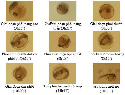 Tổng số trứng thu được 19 000 trứng, số trứng thụ tinh thu được 18 050 trứng đạt tỷ lệ thụ tinh 95%. Trứng cá mú lai (mới thụ tinh) có đường kính 0,857±0,150 mm và đường kính giọt dầu là 0,185±0,100 mm. Những thay đổi về hình thái trong quá trình phát triển được thể hiện ở Hình 3. Vào lúc 0 giờ 10 phút (0:10 giờ) sau khi thụ tinh đĩa phôi phồng lên tạo thành mũ tế bào chất. Sự phân cắt đầu tiên xảy ra lúc 0h25’ trên bề mặt đĩa phôi xuất hiện 1 rãnh dọc, chia đĩa phôi thành 2 tế bào giống nhau. Phôi phân cắt lần thứ 2 lúc 0h27 phút, xuất hiện rãnh thứ 2 vuông góc với rãnh thứ nhất chia đĩa phôi thành 4 tế bào giống nhau, phần đĩa phôi tiếp cận hình vuông. Phôi phân cắt lần thứ 3 lúc 0h29’ chia đĩa phôi thành 8 tế bào. Phần đĩa phôi tiếp cận gần giống hình chữ nhật. Phôi phân cắt lần thứ 4 lúc 0h31’ trên đĩa phôi xuất hiện 16 tế bào giống nhau, phần đĩa phôi giống hình ô van. Phôi phân cắt lần thứ 5 lúc 0h33’ đĩa phôi xuất hiện 32 tế bào tương đối giống nhau, các rãnh phân cắt không thẳng, phần đĩa phôi tiếp cận được gần giống hình tròn. Phôi phân cắt lần thứ 6 lúc 0h35’ đĩa phôi xuất hiện 64 tế bào không đều nhau các tế bào trở nên nhỏ hơn. Phôi phân cắt lần thứ 7 lúc 2h46’ trên đĩa phôi đạt được 128 tế bào không đều nhau, đĩa phôi trở nên xù xì ở giai đoạn đa tế bào còn được gọi là phôi dâu. Lúc 3h15’ đĩa phôi nhân lên nhiều tế bào, kích thước nhỏ, khó phân biệt. Khối tế bào nhô cao lên khỏi túi noãn hoàng eo thắt giữa phôi và khối noãn hoàng tương đối rõ. Lúc 3h21’ đĩa phôi tràn xuống, phủ lên khối noãn hoàng, tạo thành một khối hình cầu, eo thắt giữa túi phôi và khối noãn hoàng hoàn toàn biến mất. Lúc 3h30’ đĩa phôi tiếp tục phát triển, bao phủ ½ noãn hoàng xuất hiện một mấu lồi phát triển về phía trong đĩa phôi gọi là phôi thuẫn. 5h15’ phần chính giữa mặt lưng của thân phôi xuất hiện 4-5 đốt cơ gọi là phôi vị. 6h15’ phôi xuất hiện 2 bọng mắt lồi ra về 2 phía, thân phôi đã có 7 - 8 đốt cơ, phần sau của thể phôi xuất hiện mầm phôi. 8h15’ phôi xuất hiện 17-18 đốt cơ, tiền thân của dây sống, thân phôi uốn cong, bao phủ ½ chu vi noãn hoàng. 10h00’ thân phôi thai bao quanh 2/3 khối noãn hoàng, nhìn thấy tim phôi đập. 14h45’ phôi bao quanh gần kín khối noãn hoàng, trên đầu ngoài bọng mắt còn nhìn thấy các thùy của não bộ. 18h20’-18h30’ vỏ trứng tách làm đôi, trứng nở, ấu trùng mới nở có kích thước chiều dài 1,35-1,60 mm, giọt dầu nằm giữa noãn hoàng và hơi dịch về phía sau, có kích thước trung bình khoảng 0,26 mm, noãn hoàng hình quả lê, hơi lồi ra phía trước. Số lượng ấu trùng thu được 15 342 ấu trùng E. coioides × E. lanceolatus nở ra từ 18 050 trứng thụ tinh, đạt tỷ lệ nở 80-85%.