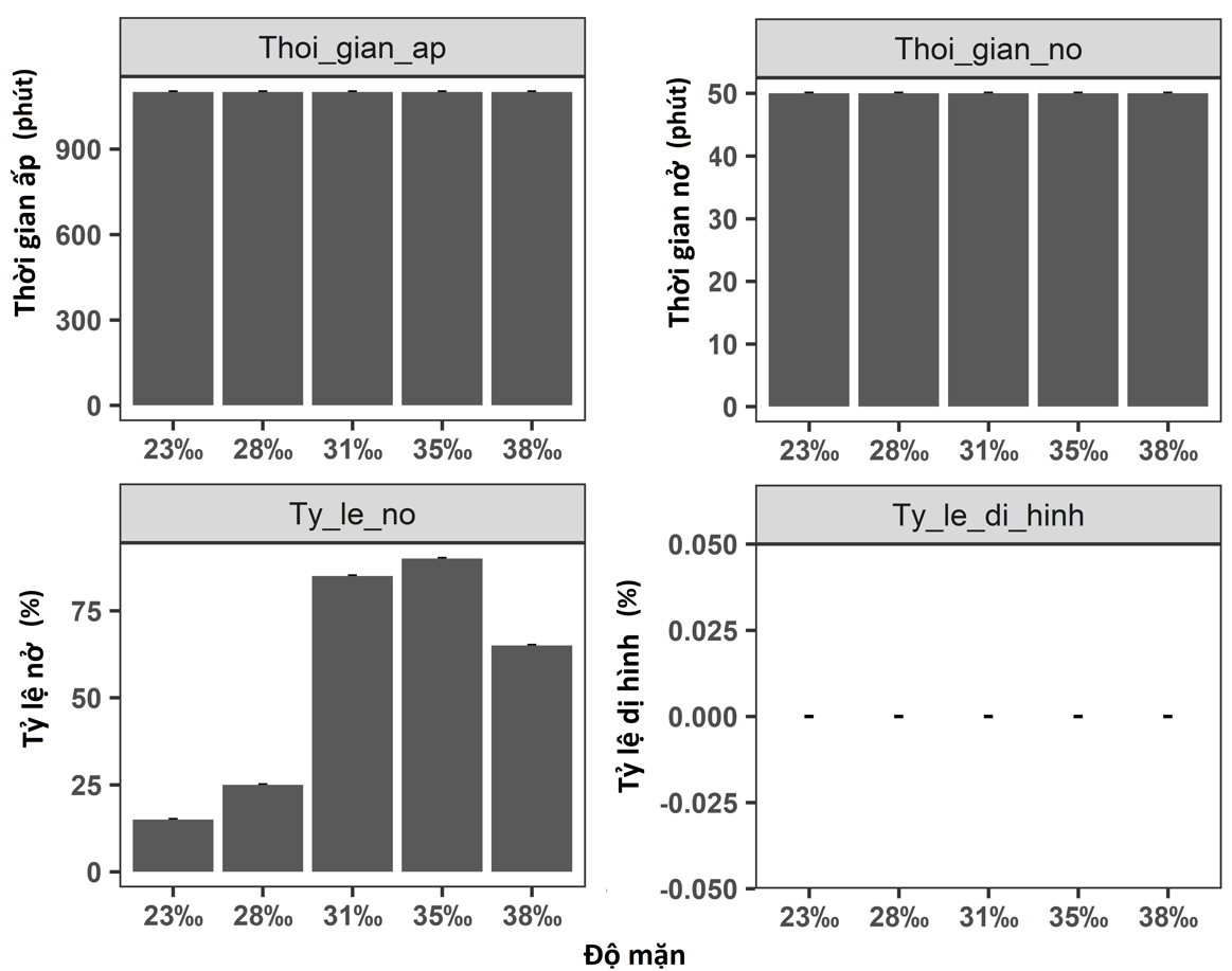 Tại độ mặn 31‰ và 35‰ có tỷ lệ nở cao lần lượt là 80±0,00% và 85±0,00%, tỷ lệ nở đạt thấp nhất ở độ mặn 23‰ (15±0,00%) và 28‰ (25±0,00%). Kết quả nghiên cứu này cho thấy, trứng thụ tinh cá mú lai ELEC có thể phát triển trong giới hạn độ mặn tương đối rộng từ 23‰ đến 38‰.