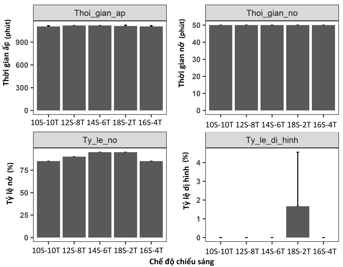 Tỷ lệ nở ở các chế độ chiếu sáng đạt từ 80% - 85%, tuy nhiên ở chế độ chiếu sáng 18 sáng - 2 tối có xảy ra hiện tượng dị hình ở tỷ lệ rất thấp 1,66 ± 2,88% (Hình 5).