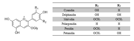 Anthocyanins là một nhóm hợp chất flavonoid, thuộc họ flavonoids, chịu trách nhiệm tạo nên sự đa dạng màu sắc từ hồng, đỏ, tím cho đến xanh đậm trong các loại thực phẩm như khoai lang tím, hoa đậu biếc, bắp cải tím,…[6]. Do sở hữu các liên kết giữa anthocyanidin và nhóm đường tạo nên các glycoside flavonoid, đồng thời là các phân tử phân cực nhờ chứa nhiều nhóm hydroxyl, nhờ đó mà anthocyanins dễ dàng hòa tan trong nước và các dung môi phân cực [7]. Độ ổn định của anthocyanins bị ảnh hưởng bởi một số yếu tố như pH, nhiệt độ và ánh sáng [8]. Trong tự nhiên, anthocyanins tồn tại dưới 6 dạng chính (Hình 1): Pelargonidin có màu đỏ cam chủ yếu tìm thấy trong quả dâu tây và các loại quả đỏ, cyanidin màu đỏ được tìm thấy trong quả mâm xôi, delphinidin có màu xanh dương thường có trong quả nho, malvidin có màu tím ở rượu vang và cuối cùng là peonidin có màu đỏ tím thường có trong quả việt quất [9].