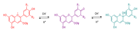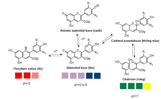 Hình 2: Cơ chế đổi màu của anthocyanins trong các môi trường pH khác nhau.