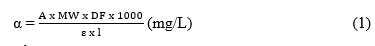 Trong đó: A: Độ hấp thụ của anthocyanins với A = (Aλvis max– A700 nm)pH 1,0 – (Aλvis max – A700 nm)pH 4,5, MW = 449,2 g/mol là khối lượng phân tử của cyanidin-3-glucosdie, DF là độ pha loãng; l là bề dày cuvet (cm); e = 26900 là hệ số hấp thụ phân tử của cyanidin-3-glucosdie (1mol-1.cm-1).