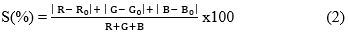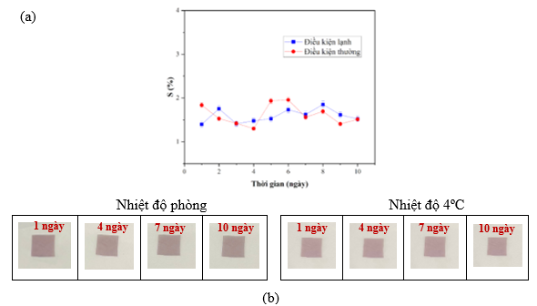 Màng chỉ thị pH được cắt theo kích thước 2x2 cm và được bảo quản ở nhiệt độ phòng và trong điều kiện lạnh 4ºC. Khảo sát màu sắc của màng sau mỗi 24 giờ bằng máy đo màu Lutron RGB-1002 (Taiwan) trong vòng 10 ngày. Mức độ thay đổi màu sắc (S%) của màng được tính toán theo công thức [14] :