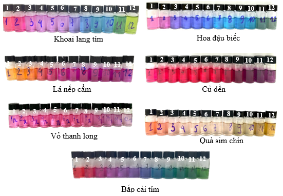 Kết quả thử nghiệm các mẫu dung dịch chiết anthocyanins từ các nguồn nguyên liệu khác nhau cho thấy rằng các dịch chiết đều có sự thay đổi màu theo pH, tuy nhiên bắp cải tím có khả năng biến đổi màu sắc rõ rệt nhất khi thay đổi từ pH 6 sang pH 7-8. Trong điều kiện axit (pH 1-2) dịch chiết khá ổn định với màu đỏ, sau đó chuyển sang màu tím ở pH 4-6, từ từ chuyển qua màu xanh lá cây ở pH 8,9,10 và giai đoạn cuối ở pH 11,12 dung dịch chuyển sang màu xanh vàng.