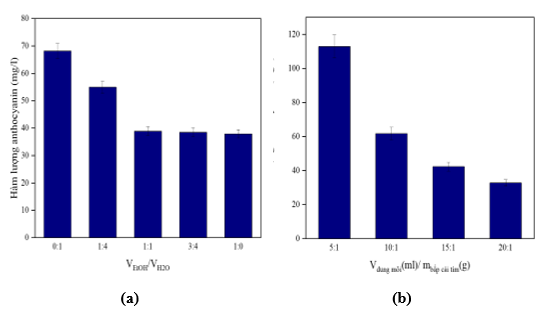 Đã tiến hành chiết anthocyanins từ bắp cải tím với tỷ lệ thể tích dung môi nước/khối lượng bắp cải tím thay đổi lần lượt là: 5/1, 10/1, 15/1, 20/1, với điều kiện nhiệt độ phòng, khuấy trong vòng 70 phút. Kết quả cho thấy, hàm lượng anthocyanins đạt giá trị cao nhất ở tỷ lệ thể tích dung môi/khối lượng bắp cải tím là 5/1, đạt 112,88 ± 6,77 mg/L và giảm khi thể tích của nước tăng dần. Điều này chứng tỏ, tỷ lệ thể tích dung môi nước/khối lượng bắp cải tím 5:1 là phù hợp để có thể hoà tan tốt nhất anthocyanins trong bắp cải tím. Các tỷ lệ thể tích dung môi nước/khối lượng bắp cải tím nhỏ hơn (1/1-4/1) cũng đã được khảo sát, tuy nhiên, lượng dung môi không đủ để thực hiện phản ứng khuấy, không có đủ dung môi để hoà tan được tối đa anthocyanins.