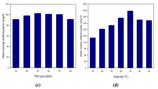 Khi tăng nhiệt độ, tốc độ chiết anthocyanins sẽ tăng nhưng đồng thời cũng có khả năng xảy ra sự phân hủy chất ở nhiệt độ cao, nên đây cũng là một yếu tố quan trọng cần khảo sát để tối ưu quá trình chiết. Như có thể thấy trên hình 4, khi tăng nhiệt độ chiết, hàm lượng anthocyanins tăng gần như tuyến tính và đạt được giá trị cực đại ở nhiệt độ 70°C (178,93± 5,37 mg/L). Tương tự như yếu tố thời gian, anthocyanins cũng dễ dàng bị phân huỷ khi ở nhiệt độ cao. Vì vậy 70°C là nhiệt độ thích hợp cho phản ứng chiết anthocyanins.