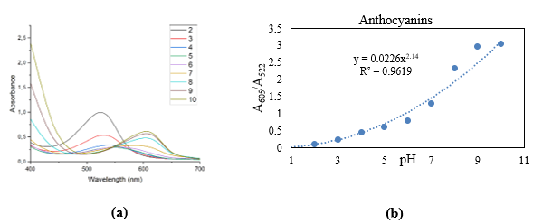 Trên hình 5(a) là phổ hấp thụ phân tử UV-Vis của dịch chiết bắp cải tím tại các giá trị pH thay đổi từ 2 đến 10. Có thể thấy, cùng với sự thay đổi màu sắc của dung dịch, các cực đại hấp thụ đặc trưng và độ hấp thụ quang tại bước sóng cực đại cũng thay đổi theo pH. Tại pH 2-3, các dung dịch có cực đại hấp thụ ở bước sóng 522 nm. Khi pH tăng từ 4-6, đỉnh hấp thụ cực đại dịch chuyển về bước sóng 550 nm cùng với sự thay đổi màu sắc từ đỏ sang tím. Đỉnh hấp thụ cực đại dịch chuyển về bước sóng khoảng 600 nm khi pH tăng lên 7 cùng với sự thay đổi màu sắc từ tím và xanh dương. Ở pH 8-10, màu của dung dịch chuyển sang xanh lá cây- vàng, độ hấp thụ cực đạt ở bước sóng khoảng 610 nm. Sự dịch chuyển bước sóng cực đại do sự thay đổi cấu trúc của anthocyanins từ cation flavylium sang hemiketal hoặc quinonoidal [8].