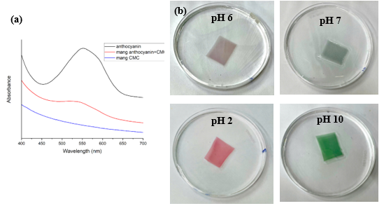 Trên hình 6(a) là phổ hấp thụ phân tử của dung dịch anthocyanins, dung dịch màng chỉ thị (chứa nanocellulose, CMC, anthocyanins) và dung dịch màng chỉ thị nhưng không chứa anthocyanins. Phổ hấp thụ phân tử của dung dịch anthocyanins cho thấy 1 đỉnh hấp thụ cực đại ở bước sóng 550 nm. Đỉnh hấp thụ này cũng xuất hiện trên dung dịch màng có chứa chất chỉ thị nhưng không có đỉnh hấp thụ cực đại nào đối với dung dịch màng không chứa anthocyanins. Do đó, có thể kết luận rằng, anthocyanins đã được kết hợp vào trong mạng lưới nanocellulose và CMC của màng.