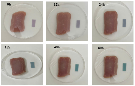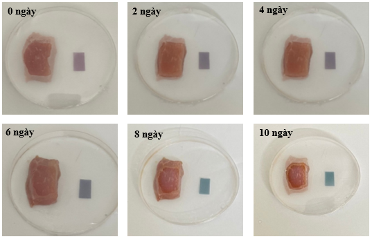 Hình 8: Sự thay đổi màu sắc của màng chỉ thị độ tươi của thịt trong các khoảng thời gian khác nhau ở nhiệt độ phòng.