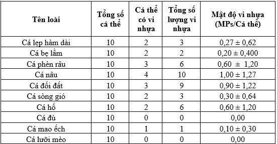 Trong nghiên cứu, mật độ vi nhựa trong từng loài cá đã được phân tích, tập trung vào số lượng vi nhựa trung bình trên mỗi cá thể (Microplastics/cá thể (MPs/cá thể)). Kết quả thu được giúp so sánh mức độ nhiễm vi nhựa giữa các loài, từ đó đánh giá những yếu tố có thể ảnh hưởng đến sự khác biệt này. Kết quả phân tích được trình bày trong Bảng 2.