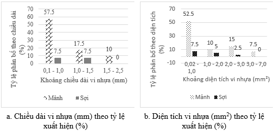 Chiều dài vi nhựa dao động từ 0,140-2,322 mm. Trong đó, chiều dài phổ biến nhất nằm trong khoảng từ 0,100-1,000 mm có 23 mảnh và 3 sợi, chiếm 65,0% tổng số mẫu quan sát (Hình 4). Trong khoảng 1,000-1,500 mm, có 7 mảnh và 3 sợi, chiếm 25,0% tổng số mẫu. Chỉ có 4 mảnh vi nhựa nằm trong khoảng 1,500-2,500 mm, vi nhựa dạng sợi không có trong khoảng kích thước này. Diện tích vi nhựa dao động từ 0,026 mm2 - 6,376 mm2.