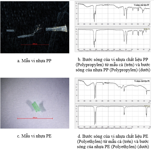 Phân tích FTIR xác định các hạt vi nhựa thu được trong nghiên cứu thuộc hai loại polymer là polyethylene (PE) và polypropylene (PP) (Hình 5). Trong đó, PE chiếm ưu thế với 27 mẫu (67,5%) và PP chiếm 13 mẫu (32,5%) trên tổng số 40 mẫu vi nhựa.