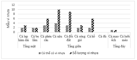 Số lượng vi nhựa tích tụ là khác nhau giữa các nhóm cá phân bố ở các tầng nước khác nhau. Kết quả cho thấy có từ 2 đến 4 cá thể của mỗi loài cá tầng mặt và tầng giữa có vi nhựa trong ống tiêu hóa, có một cá thể tại tầng đáy có vi nhựa (Hình 6). Mật độ vi nhựa trung bình của các nhóm cá phân bố tầng mặt, tầng giữa và tầng đáy lần lượt là 0,25 ± 0,54 MPs/cá thể, 0,57 ± 1,08 MPs/cá thể, và 0,05 ± 0,21 MPs/cá thể.