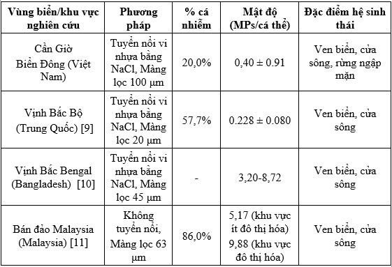 Mức độ nhiễm vi nhựa trong cá tại Cần Giờ và các vùng ven biển - cửa sông có điều kiện sinh thái tương đồng được trình bày trong Bảng 3. Kết quả cho thấy tại vịnh Bắc bộ (Biển Đông, Trung Quốc) có 57,7% cá nhiễm vi nhựa trong hệ tiêu hóa với mật độ dao động 0.228 ± 0.080 MPs/cá thể [9]; tại vịnh Bắc Bengal (Bangladesh), mật độ vi nhựa từ 3,20 đến 8,72 MPs/cá thể [10]; khu vực ven biển bán đảo Malaysia, tỷ lệ nhiễm đạt 86% với mật độ trung bình 5,17 MPs/cá thể ở khu vực ít đô thị hóa và 9,88 MPs/cá thể ở khu vực đô thị [11]. Như vậy, mức cá nhiễm vi nhựa tại Cần Giờ ở ngưỡng thấp - trung bình, gần giá trị thấp nhất ghi nhận tại Vịnh Bắc Bộ và thấp hơn rõ rệt so với Malaysia và Bangladesh, cho thấy áp lực nguồn thải nhựa tại khu vực này chưa quá cao nhưng vẫn khẳng định sự hiện diện của vi nhựa trong hệ sinh thái thủy sinh.