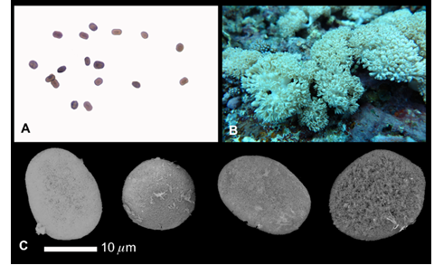 Hình 3. Hình dạng trâm xương dưới kinh hiển vi thường ở độ phóng đại 10 x 40 (A); cấu trúc bề mặt trâm xương dưới kính hiển vi điện tử quét - SEM (C) và hình thái tập đoàn ngoài tự nhiên (B) loài Xenia novaebritanniae