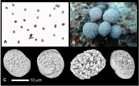 Hình 2. Hình dạng trâm xương dưới kinh hiển vi thường ở độ phóng đại 10 x 40 (A); cấu trúc bề mặt trâm xương dưới kính hiển vi điện tử quét - SEM (C) và hình thái tập đoàn ngoài tự nhiên (B) loài Xenia lillieae