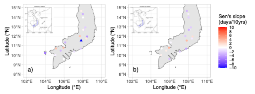 In terms of trends, the rainy seasons in both the Central Highlands and Southern regions tend to occur earlier, about 5–7 days per decade, consistent with findings from [5, 14 and 20]. Additionally, [19] observed that the monsoon onset dates in the Bay of Bengal, Indochina Peninsula, and western Pacific (around 120–140°E) have shifted 10–15 days earlier in recent decades, comparing the periods 1979–1993 and 1994–2008. For the RSCD, the results indicate a trend toward earlier occurrence by approximately 2 to 3 days per decade. These changes suggest a systematic shift in the timing of the rainy season across the region. However, understanding the causes of this shift will require further investigation within a broader climate change context, such as anthropogenic warming, land–atmosphere feedback, and regional circulation changes as key drivers of variability and trends in rainy season timing.