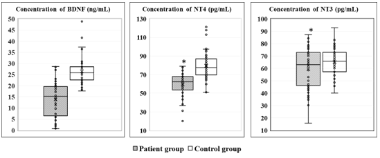 Figure 1. Serum concentrations of BDNF, NT-3, and NT-4 in the study participants. (*p < 0.05 indicates a statistically significant difference between groups.)