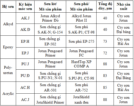 Mẫu thử là hệ thống bao gồm vật liệu nền, lớp sơn lót và lớp sơn phủ. Có 4 hệ sơn được thử nghiệm, mỗi hệ sơn có 2 mác đại diện (Bảng 2). Mẫu thử được chuẩn bị theo phương pháp mô tả trong tài liệu báo cáo [7]. Vật liệu nền là thép Ct-3 có độ nhám bề mặt mẫu đạt từ 0,5 đến 1,14 μm với kích thước (150 x 75 x 2) mm. Các mẫu sơn sau khi chuẩn bị xong được ổn định ở điều kiện phòng thí nghiệm trong ít nhất 7 ngày, sau đó tiến hành thử gia tốc.