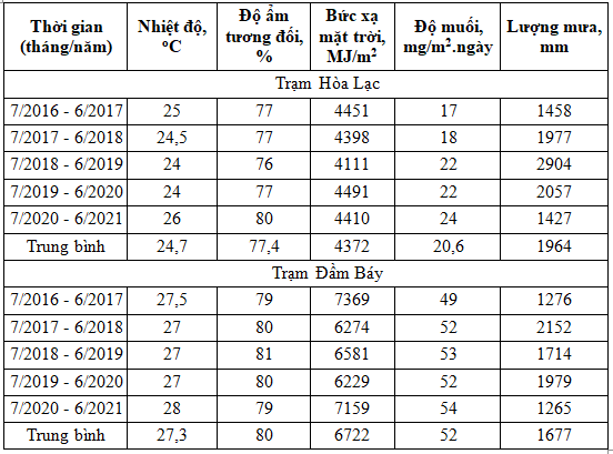 Thử nghiệm tự nhiên ngoài trời đã được tiến hành trong giai đoạn (2016 - 2021) tại trạm thử nghiệm Đầm Báy nằm trên đảo Hòn Tre, tỉnh Khánh Hòa (Vĩ độ 12o14’ Bắc, Kinh độ 109o17’ Đông), nơi có khí hậu nhiệt đới biển và trạm thử nghiệm Hòa Lạc nằm ở ngoại ô thành phố Hà Nội (Vĩ độ 22o45’ Bắc, Kinh độ 105o45’ Đông, cách biển 96 km), nơi có khí hậu nhiệt đới nông thôn. Thống kê dữ liệu khí tượng - môi trường trong 5 năm thử nghiệm tại 2 trạm được trình bày trong Bảng 3 [7].