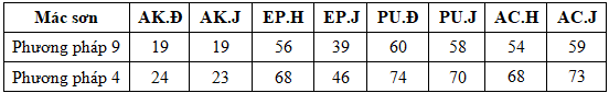 Dữ liệu về khả năng bảo vệ chống ăn mòn của các mác sơn khi thử nghiệm theo phương pháp 9 và phương pháp 4 được trình bày trong Bảng 5. Giá trị trong Bảng 5 là số chu kỳ gia tốc mà mẫu thử đạt tới mức ăn mòn điểm 3.