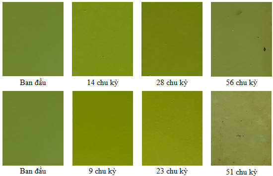 Hình 1 cho thấy quá trình biến đổi ngoại quan của mẫu sơn EP.H khi thử nghiệm gia tốc, trong đó: hàng trên ứng với thử nghiệm theo phương pháp 4; hàng dưới ứng với thử nghiệm theo phương pháp 9.