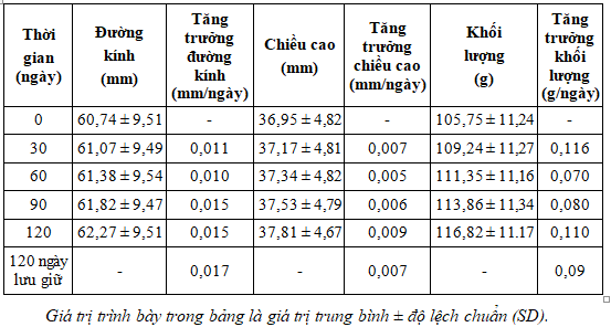 Bảng 3. Tăng trưởng của nhum sọ trong quá trình lưu giữ nội vi ở Đầm Báy