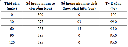 Bảng 4. Tỷ lệ sống của nhum sọ lưu giữ nội vi ở Đầm Báy