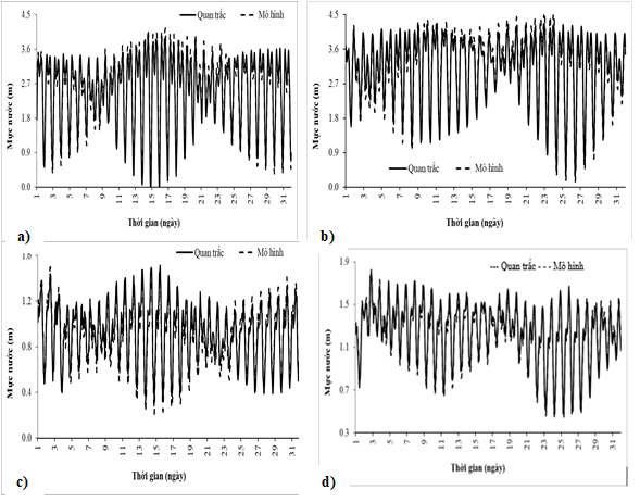 Hình 2. So sánh mực nước tính toán từ mô hình và quan trắc: a) Vũng Tàu, 7/2022, b) Vũng Tàu, 12/2022, c) Sơn Chà, 7/2022, d) Sơn Chà, 12/2022