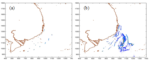Kết quả mô phỏng sự phát tán nguồn giống dưới ảnh hưởng của gió mùa tây nam (tháng 7-8) ở tầng mặt (Hình 3) với thời gian sinh sản liên tục trong vòng 7 ngày đã cho thấy sự di chuyển nhanh chóng của nguồn giống ở khu vực. Nguồn giống có xu hướng lan rộng về phía nam và tây nam, theo hướng dòng chảy. Ngày đầu tiên của chu kì sinh sản, nguồn giống tập trung cục bộ ở từng khu vực sinh sản với mật độ chủ yếu từ 2-12 cá thể/m3 (Hình 3a). Chỉ sau khoảng 8 ngày, nguồn giống di chuyển chủ yếu theo hướng nam và tây nam (Hình 3b), cách vị trí ban đầu có thể lên đến 100 km, với mật độ từ 1 đến 6 cá thể/m3, có nơi lên đến 12 cá thể/m3. Nguồn giống vào thời điểm này cũng di chuyển dọc theo bờ biển lên phía bắc một chút, cách vị trí ban đầu khoảng 50 km. Từ sau 16 ngày, phía bắc khu vực nghiên cứu nguồn giống ít biến động hơn so với phía nam. Mật độ nguồn giống và diện tích phát tán tăng dần, toàn bộ vùng biển phía nam và ven biển từ Quảng Ngãi trở xuống đến Vũng Tàu đều có sự hiện diện của nguồn giống. Càng ra ngoài khơi, mật độ nguồn giống giảm dần. Từ sau 40 ngày, mật độ cá thể được phát tán rộng ra đã tăng đáng kể. Cách 300 km so với vị trí ban đầu vẫn nhận thấy mật độ 12 cá thể/m3 (Hình 3).