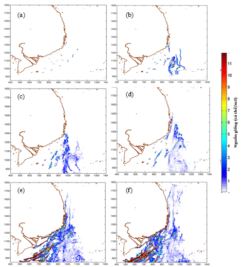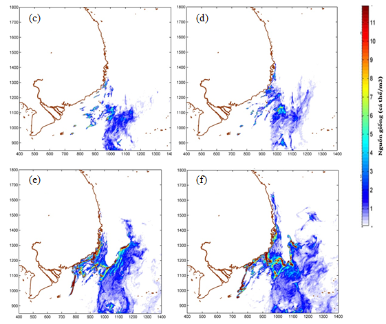 Hình 4. Quá trình phát tán nguồn giống khu vực nghiên cứu (cá thể/m3) dưới ảnh hưởng của gió đông bắc: tầng mặt (a-sau 1 ngày, b-sau 8 ngày); tầng giữa (c-sau 16 ngày, d-sau 24 ngày); tầng đáy (e-sau 32 ngày, f-sau 40 ngày)