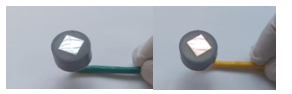 Chuẩn bị các mẫu điện cực làm việc: Điện cực làm việc là các mẫu kim loại hình vuông làm bằng thép CT3 và đồng M1 có kích thước cạnh 10 mm, dày 3mm. Mẫu kim loại được hàn với dây dẫn bằng đồng có vỏ bọc cách điện. Mẫu sau đó được đúc vào nền nhựa epoxy hình tròn đường kính 21 mm (Hình 1). Bề mặt các điện cực làm việc được mài phẳng bằng giấy nhám thô P-800, sau đó giấy nhám mịn P-2000. Sau đó mẫu được rửa sạch bằng ethanol 96% và acetone, để khô và bảo quản trong bình hút ẩm. Các mẫu điện cực được nhúng vào dung dịch ức chế ăn mòn ĐB-2.1 với các nồng độ khác nhau 15; 25; 35; 45; 55 g/L. Đối với mỗi loại dung dịch ĐB-2.1 nhúng 03 mẫu điện cực làm việc. Thời gian nhúng mẫu điện cực vào dung dịch chất ức chế là 2 phút. Sau khi nhúng, mẫu được treo lên giá, để khô ở nhiệt độ phòng trong thời gian 24 giờ trước khi thử nghiệm.