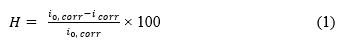 Trong đó: H là hiệu quả bảo vệ chống ăn mòn, %; i0,corr là mật độ dòng ăn mòn của mẫu điện cực không có chất ức chế, (A/cm2); icorr là mật độ dòng ăn mòn của mẫu điện cực có chất ức chế ăn mòn, (A/cm2).
