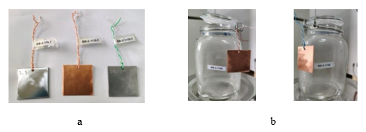 Chuẩn bị mẫu kim loại để thử nghiệm mù muối và thử nghiệm nhiệt ẩm: Mẫu kim loại hình vuông được làm từ thép CT-3 và đồng M1, có kích thước cạnh 50 mm, chiều dày từ 1,5 mm đến 3,0 mm (Hình 2-a). Các mẫu được khoan một lỗ nhỏ ở chính giữa mép cạnh đường kính 2 mm để treo mẫu. Dùng dập số đánh số các mẫu kim loại thử nghiệm. Các mẫu kim loại được làm sạch bề mặt bằng giấy nhám thô P-240, sau đó giấy nhám mịn P-800. Mẫu kim loại sau đó được rửa sạch bằng acetone, để khô và được bảo quản trong bình hút ẩm trước khi tiến hành thử nghiệm. Cân các mẫu kim loại thử nghiệm, với độ chính xác đến 0,0001 g. Nhúng các mẫu kim loại đã được chuẩn bị vào dung dịch ức chế ăn mòn ĐB-2.1 với hàm lượng chất ức chế ăn mòn 15; 25; 35; 45; 55 g/L. Đối với mỗi loại dung dịch ĐB-2.1 nhúng 03 mẫu kim loại. Các mẫu sau khi nhúng được treo lên giá, để khô ở nhiệt độ phòng trong thời gian 24 giờ trước khi thử nghiệm.
