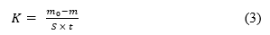 Trong đó: K, tốc độ ăn mòn kim loại, g/(m2.h); m0 là khối lượng kim loại trước thử nghiệm, g; m là khối lượng kim loại sau thử nghiệm, g; S là diện tích mẫu kim loại dùng để thử nghiệm, m2; t là thời gian thử nghiệm, h.
