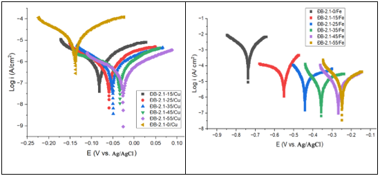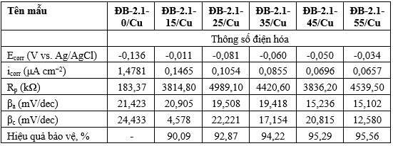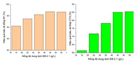 Kết quả Bảng 1 và Bảng 2 cho thấy, khi nồng độ chất ức chế ăn mòn trong dung dịch ĐB-2.1 tăng từ 15 g/L đến 55 g/L, mật độ dòng ăn mòn của đồng M1 giảm từ 10,09 lần (15 g/L) đến 22,50 lần (55 g/L); của thép CT3 giảm từ 2,82 lần (15 g/L) đến 6,99 lần (55 g/L) so với mẫu không có chất ức chế, cũng đồng nghĩa hiệu quả bảo vệ chống ăn mòn đồng M1 và thép CT3 tăng dần. Mức độ giảm mật độ dòng ăn mòn của đồng M1 (22,50 lần) cao hơn so với của thép CT3 (6,99 lần) cho thấy dung dịch ức chế ăn mòn ĐB-2.1 có hiệu quả bảo vệ kim loại đồng M1 tốt hơn so với bảo vệ thép CT3.