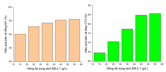 Kết quả thử nghiệm nhiệt ẩm trong bình kín với hơi ẩm ngưng tụ tuần hoàn đối đối với dung dịch ĐB-2.1 (Hình 11) cho thấy, ở điều kiện tác động bởi hơi ẩm và nhiệt độ hiệu quả bảo vệ chống ăn mòn của dung dịch ĐB-2.1 trên nền thép CT3 tăng 74% đến 95%; trên nền đồng M1 là 92% đến 98% khi nồng độ dung dịch ĐB-2.1 tăng từ 15 g/L đến 55 g/L. Rõ ràng, so với điều kiện thử nghiệm mù muối, tốc độ ăn mòn các mẫu thử giảm đáng kể, vì vậy hiệu quả bảo vệ chống ăn mòn thép CT3 và đồng M1 của dung dịch ức chế ăn mòn ĐB2.1 cao hơn.