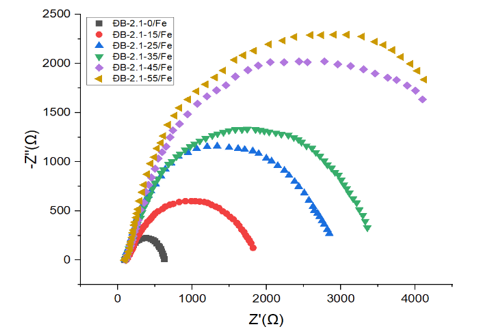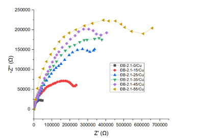 Kết quả đo tổng trở điện hóa với điện cực làm việc bằng đồng M1 (Hình 5) cho thấy, tổng trở điện hóa của hệ mạch gồm dung dịch điện ly (NaCl) - Chất ức chế ĐB-2.1 - Bề mặt kim loại tăng dần theo chiều tăng của nồng độ dung dịch ức chế ăn mòn ĐB-2.1. Khi nồng độ chất ức chế ăn mòn ĐB-2.1 tăng từ 0 g/L đến 55 g/L tổng trở điện hóa của hệ mạch tăng nhanh. Điều đó chứng tỏ khả năng ức chế ăn mòn hiệu quả của dung dịch ĐB-2.1 đối với vật liệu đồng M1.
