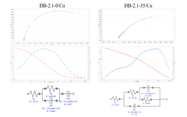 Kết quả tính toán tổng trở của hệ mạch tương đương của mẫu đồng M1 (Hình 6, Bảng 3) cho thấy, khi không có chất ức chế ăn mòn (mẫu ĐB-2.1-0/Cu) hệ mạch gồm điện trở của dung dịch điện ly và điện trở lớp oxit đồng, với tổng trở 46,951 kΩ. Khi có mặt chất ức chế ăn mòn ĐB-2.1 hình thành nên một lớp thứ ba, có điện trở cao để bảo vệ kim loại đồng M1 (tổng trở R > 497,392 kΩ). Lớp phủ bảo vệ được hình thành có thể giải thích do thành phần benzotriazol được tăng cường với cyclohexylamoni có trong dung dịch ức chế ĐB-2.1 phản ứng hóa học với oxit đồng, tạo thành lớp phức (chuỗi polyme -BTA-Cu-BTA-) thụ động [10]. Từ dữ liệu tổng trở Bảng 3 có thể khẳng định, tính chất bảo vệ kim loại đồng M1 của dung dịch ĐB-2.1 được quyết định chủ yếu bởi hình thành lớp phủ thụ động này.