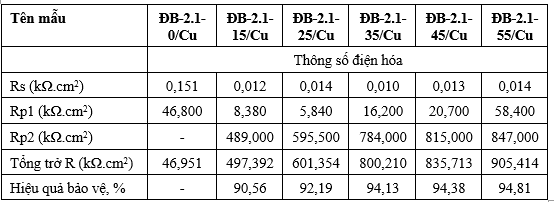 Kết quả thử nghiệm tổng trở điện hóa cho thấy, hiệu quả bảo vệ chống ăn mòn đồng M1 tăng khi nồng độ dung dịch ĐB-2.1 tăng từ 0 đến 55 g/L. Khi nồng độ dung dịch ĐB-2.1 ≥ 35 g/L hiệu quả bảo vệ tăng không đáng kể từ 94,13% đến 94,81%. Kết quả đo tổng trở điện hóa của đồng M1 khi có và không có chất ức chế ăn mòn ĐB-2.1 tương đồng với kết quả thử nghiệm đường cong phân cực tafel đã khảo sát.