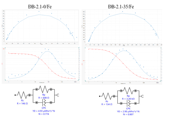 Từ mạch tổng trở đương đương Hình 8 cho thấy dạng mạch điện thu được trên các mẫu thép CT3 tương tự nhau đối với mẫu không có và có chất ức chế ăn mòn ĐB-2.1. Điều này có thể giải thích các chất ức chế ăn mòn ĐB-2.1 bảo vệ thép CT3 dựa theo cơ chế hấp phụ vật lý do hình thành liên kết hydro, van-der walls với lớp màng oxit trên bề mặt thép CT3, mà không làm biến tính bề mặt kim loại do phản ứng hóa học để hình thành lớp phủ thụ động như đối với vật liệu đồng M1. Điều này lý giải hiệu quả bảo vệ chống ăn mòn của dung dịch ức chế ĐB-2.1 đối với đồng M1 cao hơn của thép CT3.