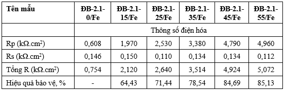 Kết quả tính toán tổng trở của hệ mạch tương đương của mẫu thép CT3 (Hình 8, Bảng 4) cho thấy, khi không có chất ức chế ăn mòn (mẫu ĐB-2.1-0/Fe) hệ mạch gồm điện trở của dung dịch điện ly (Rs) và lớp oxit sắt (Rp), với tổng trở 0,754 kΩ.cm2. Khi có mặt chất ức chế ăn mòn ĐB-2.1 điện trở của lớp oxit kim loại tăng nhanh do quá trình hấp phụ chất ức chế lên bề mặt điện cực. Khi nồng độ tăng từ 0 đến 55 g/L thì điện trở của lớp oxit được hấp phụ ức chế ăn mòn (Rp) tăng nhanh từ 0,608 kΩ.cm2 đến 4,960 kΩ.cm2. Tuy nhiên, khi nồng độ chất ức chế ăn mòn thay đổi từ 45 đến 55 g/L hiệu quả bảo vệ tăng không đáng kể từ 84,69% đến 85,13%, kết quả ghi nhận tương tự với kết quả đo đường cong phân cực. Điều này có thể được giải thích khi nồng độ chất ức chế ≥ 45 g/L thì bề mặt thép CT3 đã bị che phủ gần như hoàn toàn, độ dày lớp phủ tạo thành trên bề mặt điện cực đã đạt tối đa do đó khi tiếp tục tăng nồng độ chất ức chế thì khả năng bảo vệ thép CT3 tăng không đáng kể.
