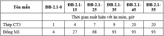 Bảng 5. Thời gian xuất hiện vết ăn mòn trong thử nghiệm mù muối.