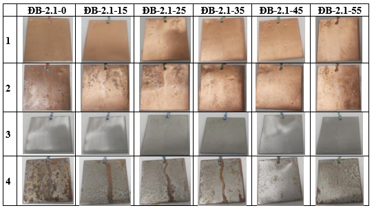 Từ kết quả thử nghiệm nhiệt ẩm với hơi ẩm ngưng tụ trong bình kín cho thấy, mẫu trắng 0 g/L và mẫu thép CT3 với hàm lượng chất ức chế ăn mòn 15 g/L xuất hiện các điểm ăn mòn nhỏ trên bề mặt và mép cạnh mẫu ở chu kỳ thứ 25. Trong khi các mẫu còn lại có nồng độ 25 g/L đến 55 g/L chưa xuất hiện vết ăn mòn trên bề mặt mẫu.