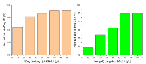 Từ kết quả Bảng 1 và Bảng 2 cho thấy, khi nồng độ chất ức chế ăn mòn ĐB-2.1 đạt từ 45 g/L đến 55 g/L độ giảm mật độ dòng ăn mòn của đồng M1 và thép CT3 thay đổi không đáng kể, lần lượt (từ 21,24 lần đến 22,50 lần) và (từ 6,60 lần đến 6,99 lần) tương ứng, so với khi không có chất ức chế ăn mòn, điều này có thể giải thích do mức bão hòa nồng độ để tạo thành lớp phủ bảo vệ vật liệu, hay nói cách khác các phân tử ức chế ăn mòn đã bao phủ toàn bộ bề mặt vật liệu.
