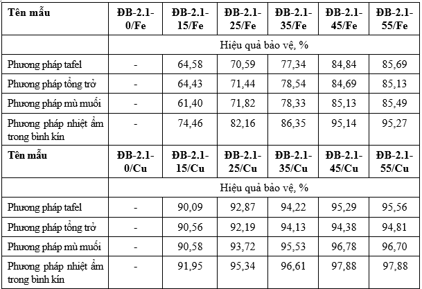 Tổng hợp kết quả đánh giá hiệu quả bảo vệ chống ăn mòn của dung dịch ức chế ăn mòn ĐB-2.1 trên thép CT3 và đồng M1 bằng các phương pháp đo đường phân cực tafel, đo tổng trở, thử nghiệm mù muối, nhiệt ẩm được trình bày trong Bảng 6.
